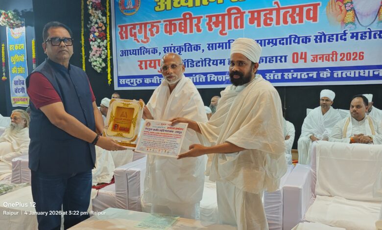 रायपुर/तिल्दा-नेवरा 10 जनवरी 2026(आरएनएस) नगर के युवा उद्योगपति एवं गौशाला संरक्षक घनश्याम अग्रवाल को सद्गुरु कबीर विश्व शांति मिशन एवं छत्तीसगढ़ संत संगठन द्वारा आयोजित सद्गुरु कबीर स्मृति महोत्सव में विशिष्ट अतिथि के रूप में आमंत्रित किया गया। इस अवसर पर कबीर पंथ के अंतरराष्ट्रीय संत शिरोमणि परम पूज्य गुरु गुरुभूषण साहेब (गुजरात) ने श्री अग्रवाल को प्रतीक चिन्ह भेंट कर सम्मानित किया।