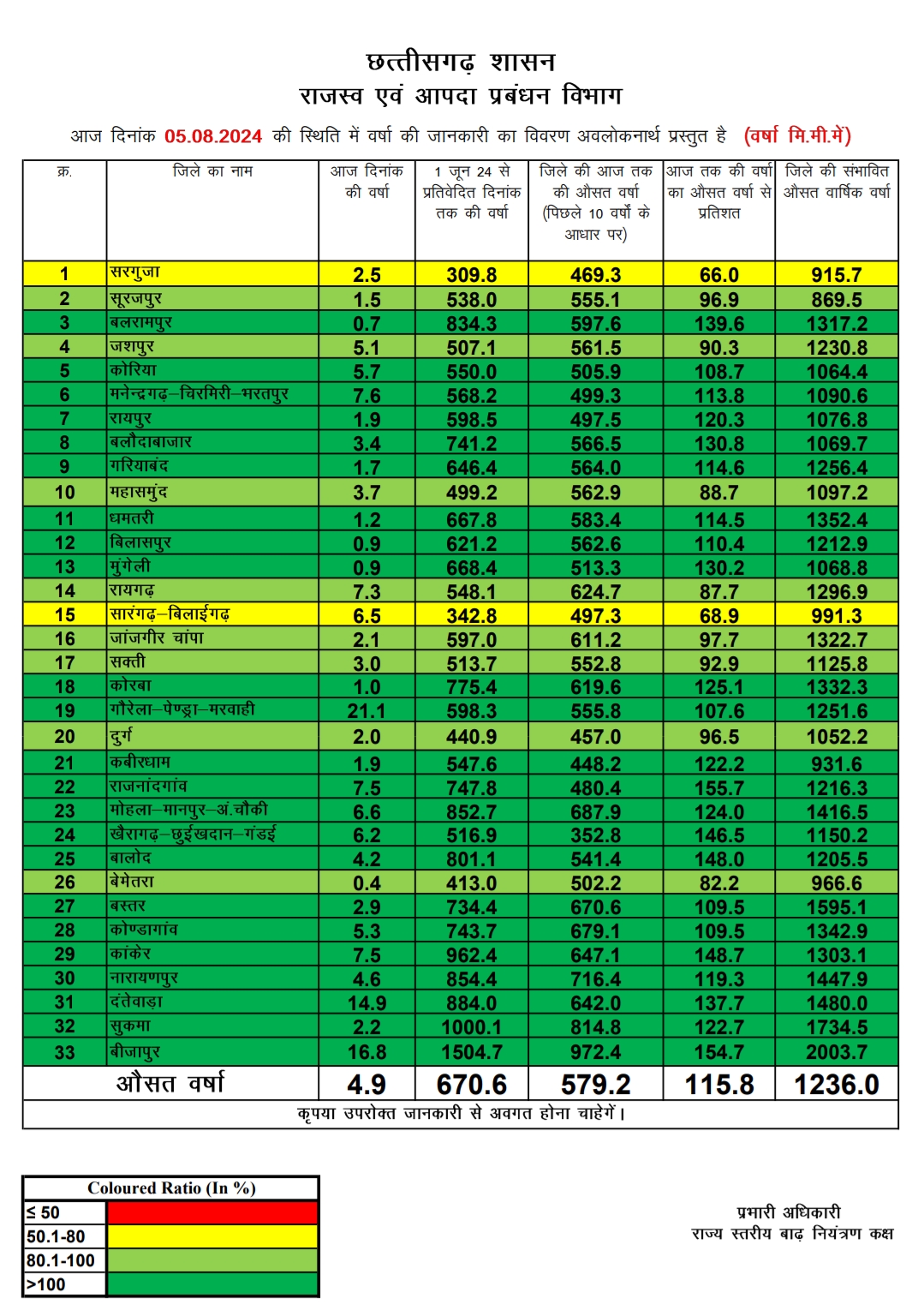 रायपुर, 05 अगस्त 2024/राज्य शासन के राजस्व एवं आपदा प्रबंधन विभाग द्वारा बनाए गए राज्य स्तरीय नियंत्रण कक्ष द्वारा संकलित जानकारी के मुताबिक एक जून 2024 से अब तक राज्य में 670.6 मिमी औसत वर्षा दर्ज की जा चुकी है। राज्य के विभिन्न जिलों में 01 जून 2024 से आज 05 अगस्त सवेरे तक रिकार्ड की गई वर्षा के अनुसार बीजापुर जिले में सर्वाधिक 1504.7 मिमी और सरगुजा जिले में सबसे कम 309.8 मिमी औसत वर्षा दर्ज की गयी है।