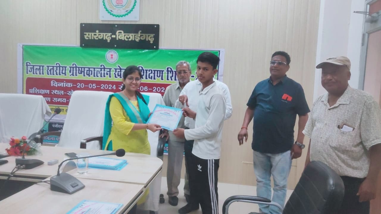 सारंगढ़ बिलाईगढ़, 30 जून 2024/ कलेक्टर कार्यालय के सभाकक्ष में गत दिवस जिला स्तरीय ग्रीष्मकालीन खेल प्रशिक्षण शिविर के खिलाड़ियों को सम्मानित किया गया। डिप्टी कलेक्टर वर्षा बंसल द्वारा प्रशिक्षण प्राप्त सभी खिलाड़ियों को प्रतीक चिन्ह और प्रशस्ति पत्र से पुरस्कृत किया गया। जिला प्रशासन के सहयोग से खेल एवं युवा कल्याण विभाग द्वारा आयोजित जिला स्तरीय खेल प्रशिक्षण शिविर का शुभारंभ कलेक्टर धर्मेश कुमार साहू के द्वारा किया गया था और उनके मार्गदर्शन में विभिन्न खेलों के सिविल निरंतर आयोजित था, लेकिन भीषण गर्मी को देखते हुए अंतिम दिनों में शिविर को स्थगित किया गया। शिविर में फुटबॉल क्रिकेट बैडमिंटन एथलेटिक्स जैसे खेलों से जुड़े नन्हे खिलाड़ी खेल प्रति शिक्षकों और सहयोगियों से प्रशिक्षण प्राप्त किये।