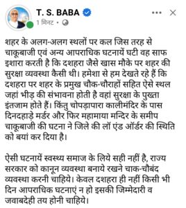 उन्होंने कहा कि “कल अंबिकापुर शहर के अलग-अलग स्थानों पर जिस तरह से चाकूबाजी एवं अन्य आपराधिक घटनाएं हुईं, उससे साफ झलकता है कि पर्व के अवसर पर सुरक्षा प्रबंधन कैसा था। चोपड़ापारा कालीमंदिर के पास दिनदहाड़े हुई हत्या और महामाया मंदिर के समीप चाकूबाजी की घटना प्रशासन की विफलता का प्रमाण है।”