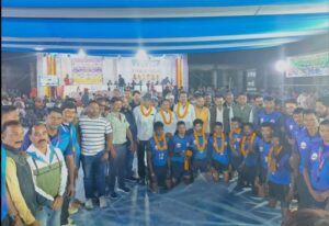 सुरेश सिंह बैस -बिलासपुर। मस्तूरी मुख्यालय में आयोजित तीन दिवसीय ब्लाक कबड्डी प्रीमियर लीग “जंगी महामुकाबला” का मेगा फाइनल अनिकेत लायंस सोंठी वर्सेज मां मनोकामना मुड़पार के मध्य खेला गया । फायनल मैच बहुत ही रोमांचक रहा, जिसमें अंतिम क्षणों में सोंठी की टीम ने 05 अंकों की बढ़त लेने के बाद विजयी हासिल किया। विजेता टीम अनिकेत लायंस सोंठी को 25,000 रुपये नगद व चैंपियन ट्रॉफी प्रदान की गई।। दूसरा स्थान पर रहे जय माँ मनोकामना मुड़पार को 20,000 रुपये नगद व ट्रॉफी प्रदान किया गया।प्रतियोगिता के सर्वश्रेष्ठ खिलाड़ी अनिकेत लायंस सोंठी के राजेश जगत को चुना गया,(5000 रुपये व ट्रॉफी)। सर्वश्रेष्ठ राइट कॉर्नर ऋषि पोर्ते को चुना गया,(2000रुपये व ट्रॉफी)।