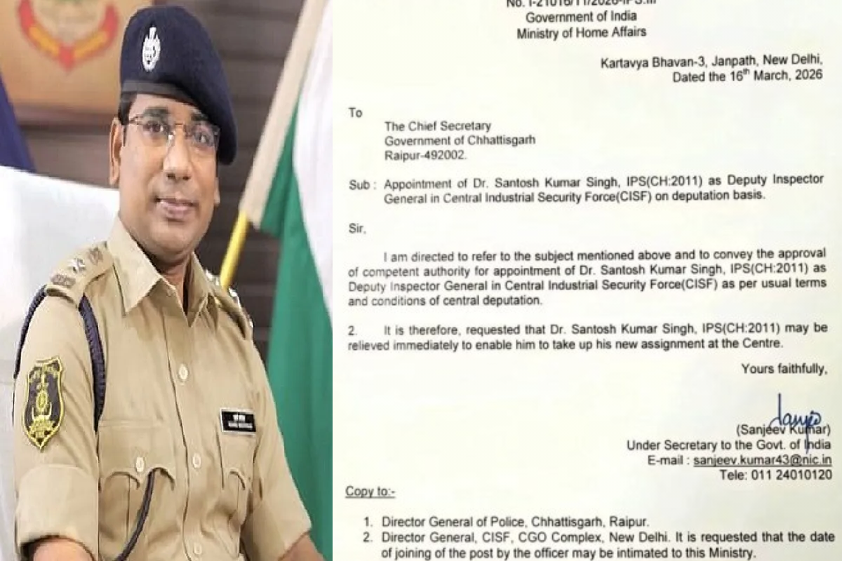 रायपुर 24 मार्च 2026/ छत्तीसगढ़ पुलिस के तेज-तर्रार अधिकारी और रायपुर के पूर्व एसपी IPS संतोष सिंह को केंद्र सरकार ने अहम जिम्मेदारी सौंपी है। उन्हें केंद्रीय औद्योगिक सुरक्षा बल (CISF) में डीआईजी के पद पर नियुक्त किया गया है।