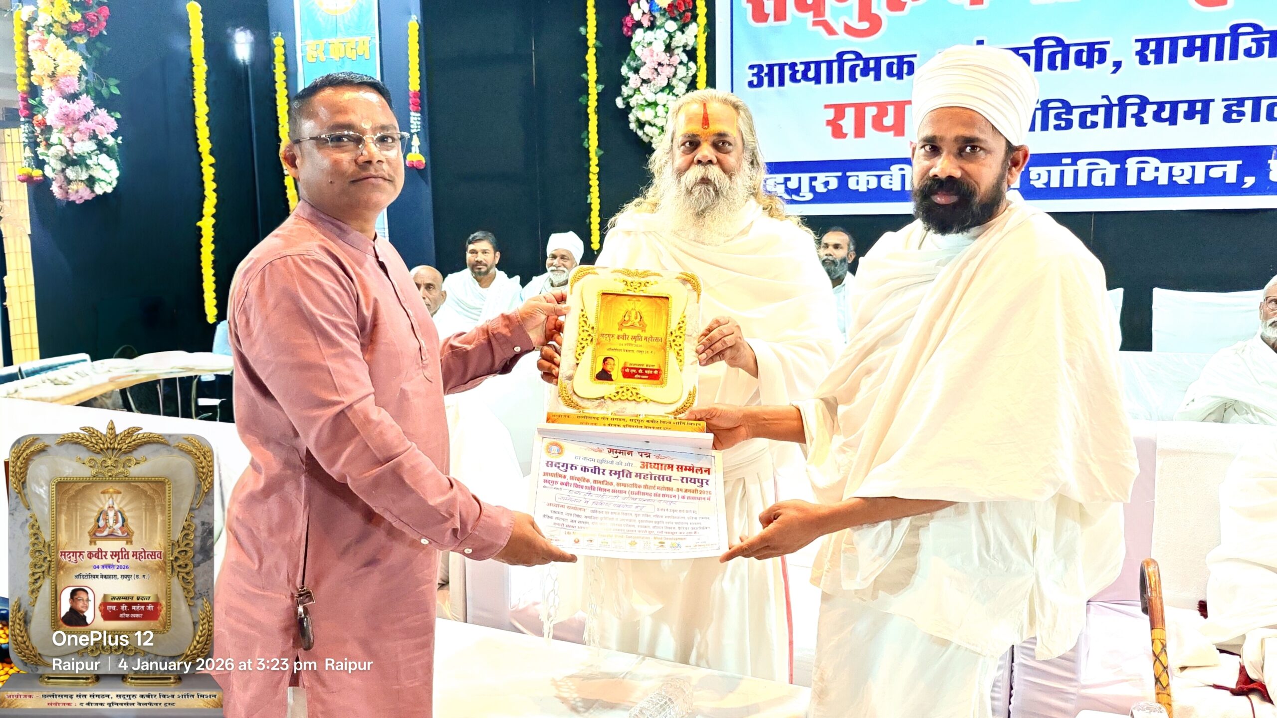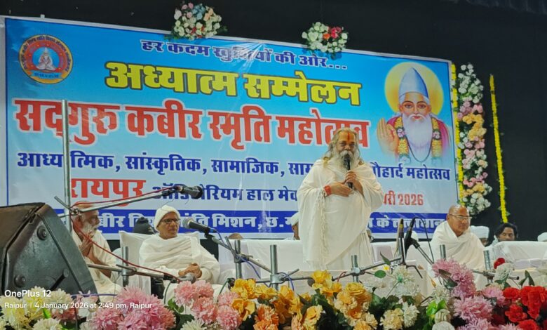 रायपुर, 04 जनवरी 2026/सद्गुरु कबीर विश्व शांति मिशन संस्थान द्वारा छत्तीसगढ़ संत संगठन के संयोजकत्व में आयोजित सद्गुरु कबीर स्मृति महोत्सव एवं आध्यात्मिक सम्मेलन का भव्य आयोजन राजधानी रायपुर स्थित मेकाहारा सभागार में प्रातः 11 बजे से अपराह्न 3 बजे तक सफलतापूर्वक सम्पन्न हुआ।