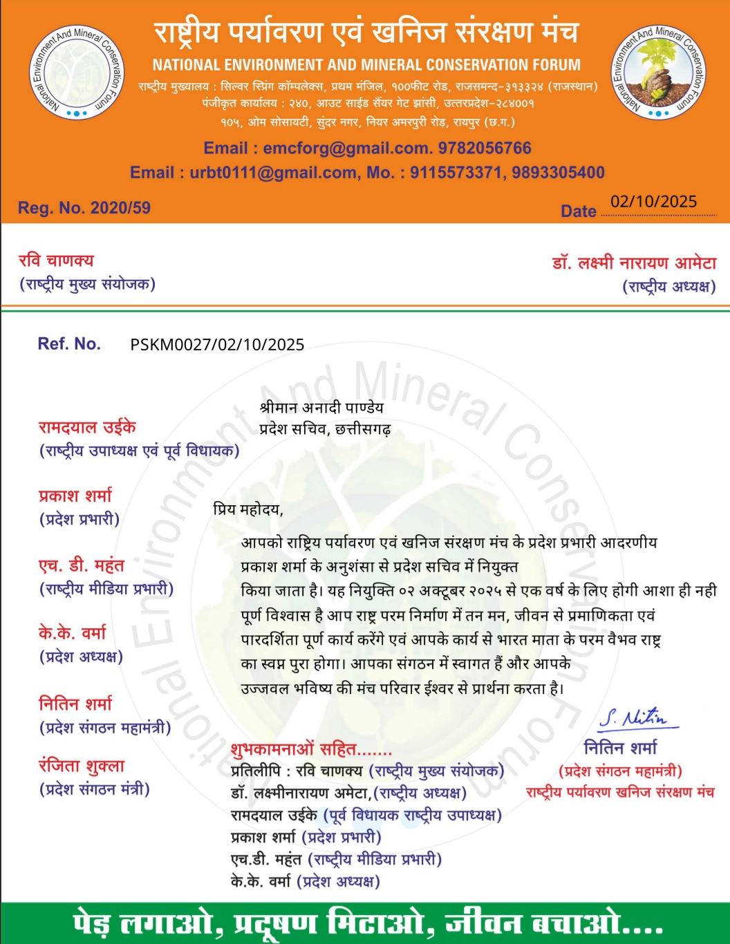 पत्र के अनुसार, पाण्डेय की नियुक्ति 2 अक्टूबर 2025 से प्रभावी है। संगठन ने विश्वास व्यक्त किया है कि वे पर्यावरण संरक्षण, प्रदूषण नियंत्रण और जनजागरूकता के क्षेत्र में सक्रिय योगदान देकर मंच की विचारधारा को सशक्त बनाएंगे।