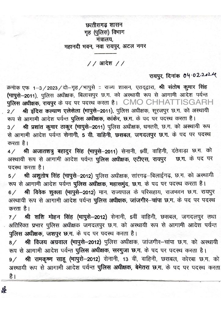 रायपुर. नई सरकार के बनने के बाद बेसब्री से जिस ट्रांसफर लिस्ट का प्रदेशवासियों को इंतेजार वो अब गई है. राज्य सरकार ने रेंज आईजी समेत करीब 25 जिलों के पुलिस कप्तानों का तबादला कर उन्हें नई जगह पदस्थ किया है. अब राजधानी रायपुर रेंज के नए आईजी अमरेश मिश्रा और रायपुर के नए एसएसपी संतोष कुमार सिंह होंगे. वहीं वर्तमान एसएसपी प्रशांत कुमार अग्रवाल को बस्तर भेजा गया है.