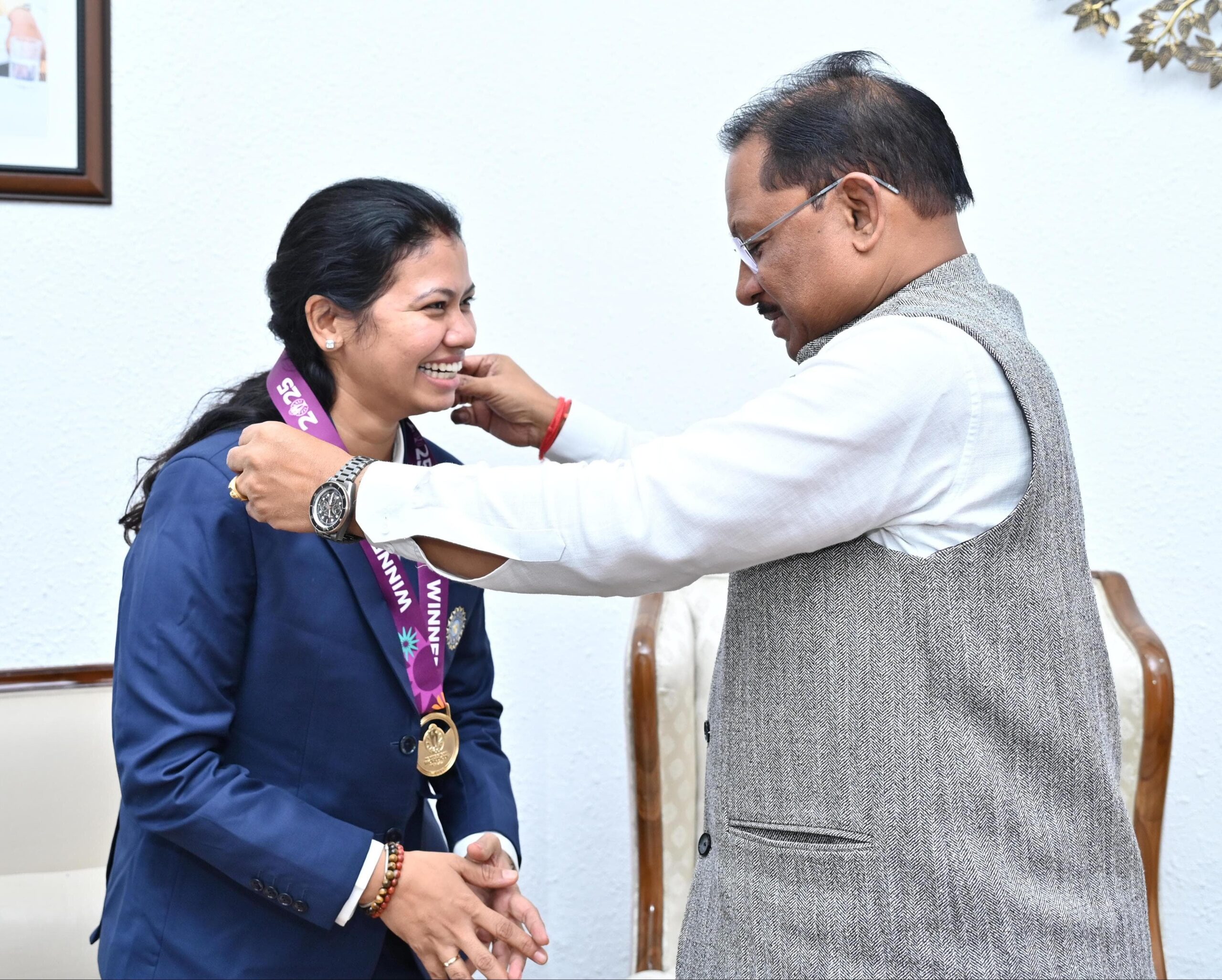 मुख्यमंत्री श्री विष्णु देव साय ने आकांक्षा सत्यवंशी की उपलब्धि की सराहना करते हुए कहा कि “आपने यह सिद्ध कर दिया है कि छत्तीसगढ़ की बेटियां किसी भी क्षेत्र में पीछे नहीं हैं। आपकी सफलता आने वाली पीढ़ियों की बेटियों को प्रेरित करेगी।”उन्होंने कहा कि राज्य सरकार खेल, शिक्षा और कौशल विकास के अवसरों को विस्तार देने के लिए प्रतिबद्ध है, ताकि और भी युवा राष्ट्रीय एवं अंतरराष्ट्रीय स्तर पर छत्तीसगढ़ का नाम रोशन कर सकें। मुख्यमंत्री ने कहा कि राज्य सरकार खेल अलंकरण सम्मान को पुनः प्रारंभ कर रही है। साथ ही, ओलंपिक में शामिल होने वाले और पदक प्राप्त करने वाले खिलाड़ियों को विशेष प्रोत्साहन राशि प्रदान की जाएगी।
