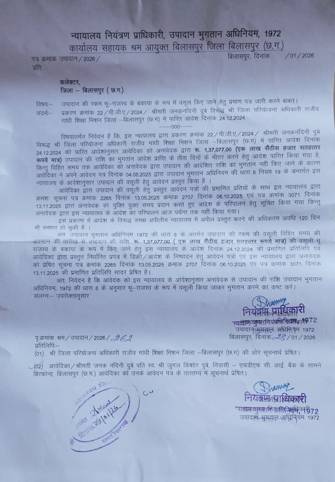 राजीव गांधी शिक्षा मिशन के अंतर्गत संचालित कस्तूरबा गांधी बालिका आवासीय विद्यालय, बरतोरी, विकासखंड बिल्हा जिला बिलासपुर मैं श्रीमती जनक नंदिनी मिश्रा पति स्व. दुबे मुख्य रसोईया के पद से उन्हें 5 फरवरी 2024 को एक तरफा मौखिक सेवानिवृत्ति दे दी गई। सेवा योजन व मानवाधिकार से जुड़ा यह मामला शासन-प्रशासन की कार्यप्रणाली पर गंभीर प्रश्नचिह्न खड़ा करता है। संस्था में निरंतर 20 वर्षों तक कलेक्टर दर पर सेवा देने वाली एक वृद्ध महिला कर्मचारी को 62 वर्ष की आयु पूर्ण होते ही बिना किसी लिखित आदेश के कार्य से इस प्रकार पृथक कर दिया गया, मानो वर्षों की सेवा का कोई मूल्य ही न हो। सेवा से पृथक करते समय उन्हें न सेवा निवृत्ति का कोई लिखित प्रपत्र दिया गया और न हीं सम्मान जनक रूप से सेवानिवृत्ति दे दी गई। उन्हें केवल मौखिक रूप से कार्य पर ना आने के लिए कह दिया गया।पीड़िता श्रीमती जनक नंदनी दुबे (उम्र 64 वर्ष) के लिए यही सेवा आजीविका का एकमात्र साधन थी। शासकीय व्यवस्था से संबद्ध संस्था में कार्य करने के बावजूद न तो कभी उनका ई.पी.एफ. काटा गया, और न ही ग्रेजुएटी की राशि प्रदान की गई। जीवन के संध्या काल में पहुंच चुकी इस महिला के समक्ष जब जीवन यापन का संकट खड़ा हुआ, तो उन्होंने न्याय की आशा में श्रम न्यायालय की शरण ली।श्रम न्यायालय द्वारा 24 दिसंबर 2024 को स्पष्ट आदेश पारित करते हुए संस्था को एक माह के भीतर नियमानुसार ग्रेजुएटी का भुगतान करने के निर्देश दिए गए, किंतु आदेश के कई माह बीत जाने के बाद भी आज तक भुगतान नहीं किया गया। पीड़िता के अनुसार संस्था प्रमुख ओम पाण्डेय (डी.एम.सी.) एवं अहमद अली जुंजानी (ए.पी.सी.) द्वारा कथित लेन-देन के आधार पर शीघ्र भुगतान का दबाव बनाया गया, जिसे स्वीकार न करने पर उन्हें लगातार टालमटोल और मानसिक प्रताड़ना का सामना करना पड़ा।निराश होकर वृद्ध महिला को पुनः श्रम न्यायालय जाना पड़ा। न्यायालय द्वारा अनावेदक संस्था को तीन बार नोटिस जारी किए गए तथा आर.आर.सी. (संपत्ति कुर्क कर वसूली) की कार्यवाही से अवगत कराया गया। संस्था प्रमुख द्वारा बार-बार समय मांगा गया, जिसे न्यायालय ने मानवीय दृष्टिकोण से स्वीकार किया, किंतु इसके बावजूद आज तक भुगतान नहीं किया गया।अंततः श्रम न्यायालय ने कठोर रुख अपनाते हुए अनावेदक संस्था के विरुद्ध आर.आर.सी. के तहत संपत्ति कुर्क कर भुगतान की कार्यवाही हेतु पत्र जारी किया है। अब प्रश्न यह है कि शासन-प्रशासन कब जागेगा और कब एक गरीब, वृद्ध महिला कर्मचारी को उसका वैधानिक अधिकार दिलाया जाएगा।यह मामला न केवल एक महिला की पीड़ा का है, बल्कि उन असंख्य अल्पवर्गीय कर्मचारियों की आवाज़ है, जिन्हें अपने ही अधिकारों के लिए दर-दर भटकना पड़ता है। संस्थान के उच्च अधिकारियों की यह 
