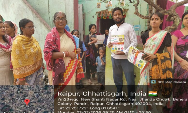 रायपुर 23 फरवरी 2026/रायपुर नगर पालिक निगम के स्वच्छ सर्वेक्षण 2025-26 अभियान के तहत जोन क्रमांक 3 स्वास्थ्य विभाग ने गुरू गोविन्द सिंह वार्ड क्रमांक 29 के बेहरा कॉलोनी, प्रगति नगर और जगन्नाथ नगर क्षेत्र में व्यापक जनजागरूकता अभियान चलाया। अभियान में वार्ड पार्षद कैलाश बेहरा के नेतृत्व में घर-घर पहुंचकर नागरिकों को सूखा और गीला कचरा अलग-अलग डस्टबिन में रखने तथा प्रतिदिन सफाई वाहन को पृथक कचरा देने के लिए प्रेरित किया गया।