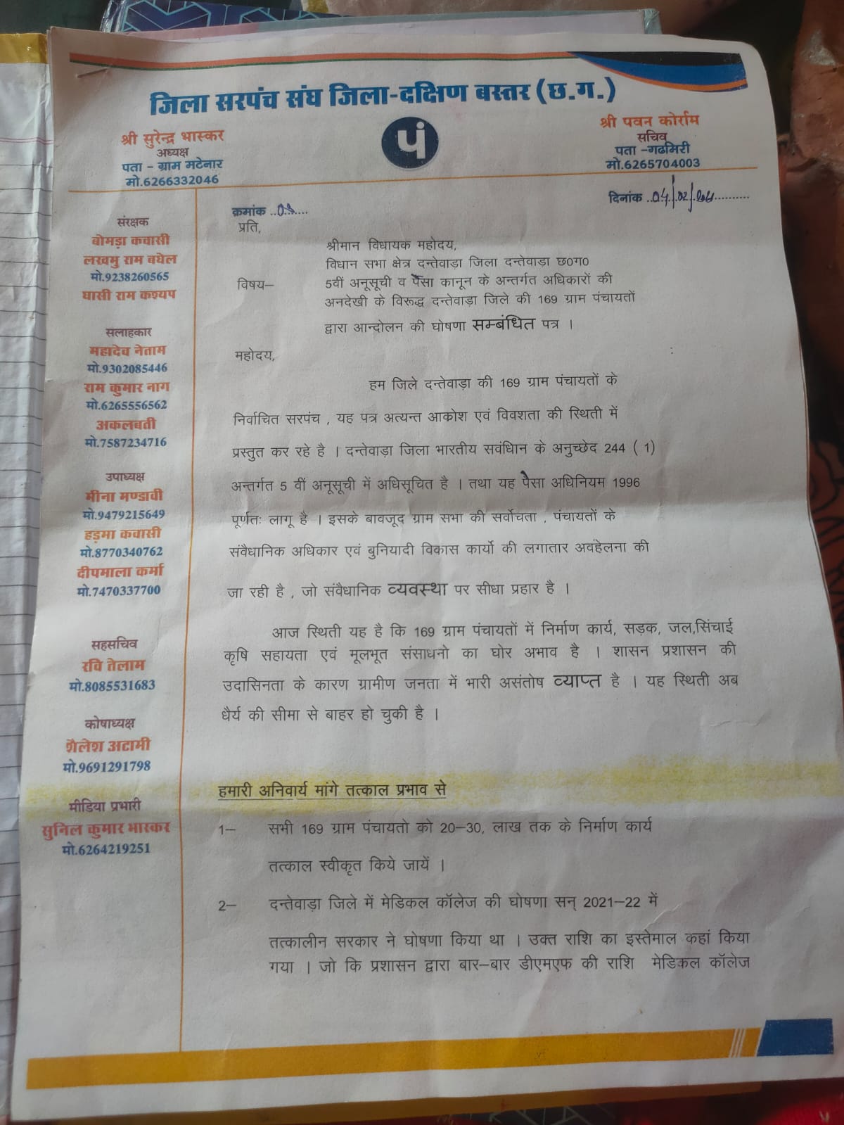 प्रमुख मांगें —सभी 169 ग्राम पंचायतों को तत्काल 20 से 30 लाख रुपये तक के निर्माण कार्य स्वीकृत किए जाएं।