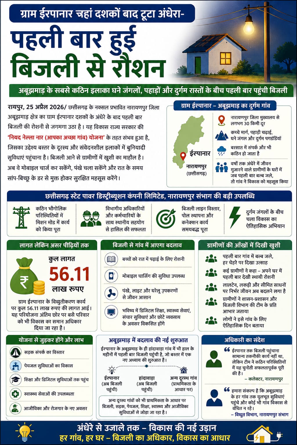 रायपुर, 25 अप्रैल 2026 / नक्सल समस्या के दूर होने के साथ बस्तर क्षेत्र में ऐतिहासिक बदलाव देखने को मिल रहा है। पहली बार दूरस्थ गांवों तक बिजली पहुँचने से अंधकार और भय कम हुआ है, जीवन स्तर में सुधार आया है और विकास को नई गति मिली है, जो बस्तर के सुरक्षित और समृद्ध भविष्य की ओर संकेत करता है। छत्तीसगढ़ के नक्सल प्रभावित नारायणपुर जिला का अबूझमाड़ क्षेत्र का ग्राम ईरपानार दशकों के अंधेरे के बाद पहली बार बिजली की रौशनी से जगमगा उठा है। यह विकास राज्य सरकार की नियद नेल्ला नार (आपका अच्छा गांव) योजना के तहत संभव हुआ है, जिसका उद्देश्य बस्तर के दूरस्थ और संवेदनशील इलाकों में बुनियादी सुविधाएं पहुंचाना है। बिजली आने से ग्रामीणों में खुशी का माहौल है। अब वे मोबाइल चार्ज कर सकेंगे, पंखे चला सकेंगे और रात के समय सांप-बिच्छू के डर से मुक्त होकर सुरक्षित महसूस करेंगे।