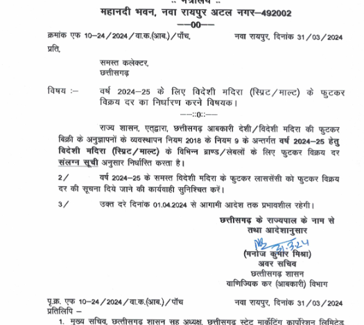 वर्ष 2024-25 के लिए देशी मदिरा मसाला और प्लेन के लिए फुटकर विक्रय दर तय की गई है.