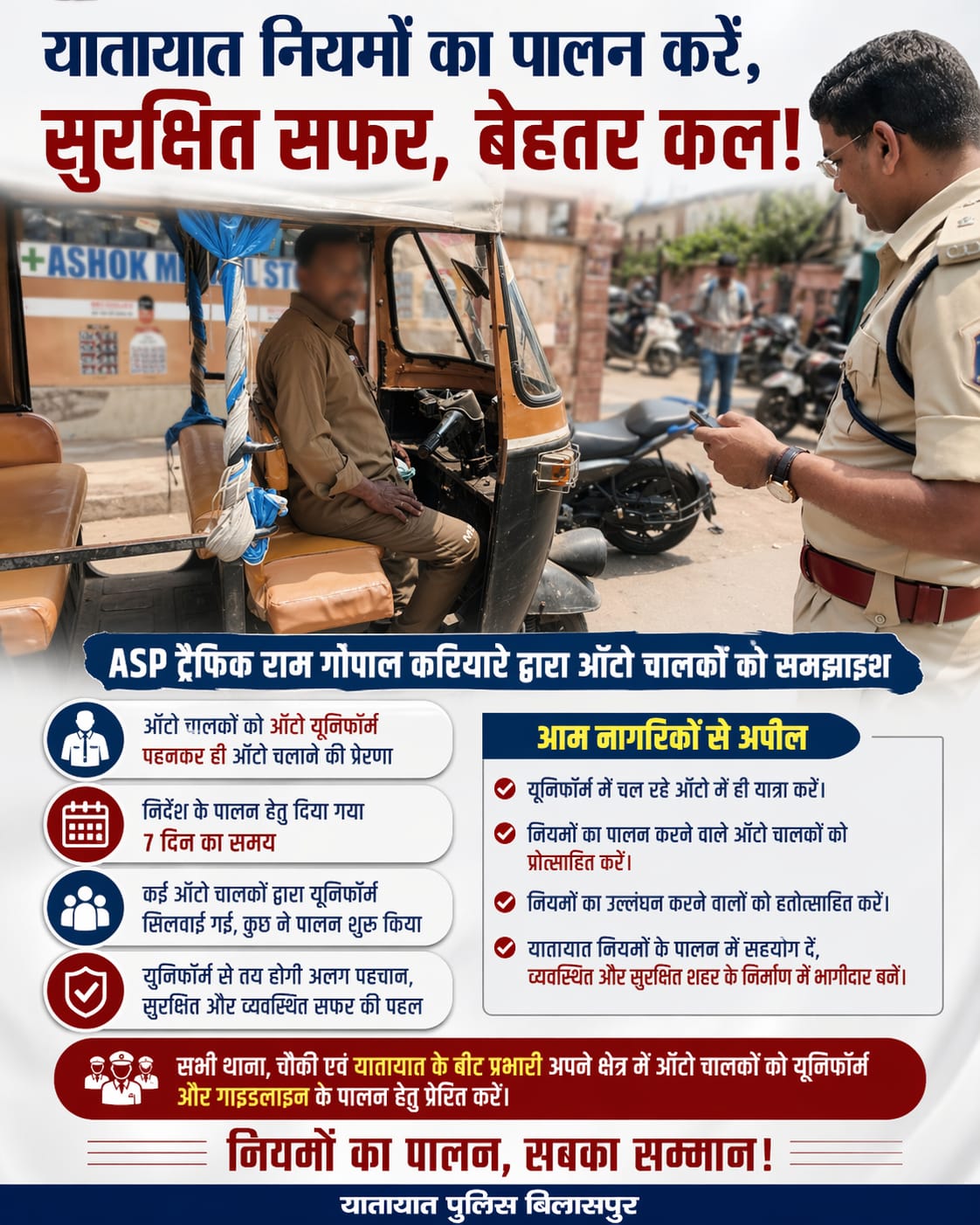 बिलासपुर 21 अप्रैल 2026/ शहर में यातायात व्यवस्था को व्यवस्थित और सुरक्षित बनाने के लिए ट्रैफिक पुलिस ने बड़ा अभियान छेड़ दिया है, जहां अब ऑटो चालकों को यूनिफॉर्म में ही सड़कों पर उतरना होगा, इस नियम को लागू कराने के लिए पुलिस ने पहले ही सभी चालकों को सात दिन का समय दिया था और अब उस समय सीमा के बाद मैदान में असर दिखना शुरू हो गया है, कई ऑटो चालक यूनिफॉर्म सिलवा चुके हैं और कुछ ने इसे पहनकर ऑटो चलाना भी शुरू कर दिया है, इस बदलाव के पीछे मकसद साफ है—हर ऑटो चालक की अलग पहचान बने, फर्जी और संदिग्ध गतिविधियों पर लगाम लगे और यात्रियों को सुरक्षित सफर का भरोसा मिले, खास बात यह है कि इस पहल को खुद ऑटो चालक भी आगे बढ़ा रहे हैं और एक-दूसरे को यूनिफॉर्म अपनाने के लिए प्रेरित कर रहे हैं, जिससे शहर में एक सकारात्मक माहौल बनता दिख रहा है, वहीं यातायात पुलिस ने सभी थाना, चौकी और बीट प्रभारियों को साफ निर्देश दिए हैं कि वे अपने-अपने क्षेत्र में जाकर ऑटो चालकों को इस ड्रेस कोड के लिए लगातार जागरूक करें और पालन सुनिश्चित कराएं, सिर्फ पुलिस ही नहीं बल्कि आम नागरिकों को भी इस अभियान में भागीदार बनाया गया है, लोगों से अपील की गई है कि वे केवल उन्हीं ऑटो में सफर करें जो निर्धारित यूनिफॉर्म में हों और जो चालक नियमों का पालन नहीं कर रहे हैं उन्हें हतोत्साहित करें, यानी अब सड़क पर हर यात्री भी व्यवस्था का हिस्सा होगा, यह पहल न केवल ट्रैफिक सिस्टम को सुधारने की दिशा में बड़ा कदम है बल्कि शहर में अनुशासन और सुरक्षा की नई मिसाल भी बन सकती है, साफ संदेश है—यूनिफॉर्म पहनिए, पहचान बनाइए और सुरक्षित बिलासपुर के निर्माण में अपनी भूमिका निभाइए, क्योंकि नियमों का पालन ही शहर को बेहतर बनाता है।