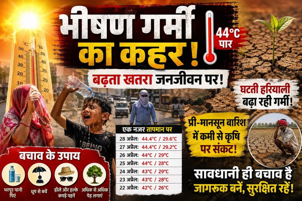 सुरेश सिंह बैस// रायपुर 28 अप्रैल 2026/ प्रदेश में पड़ रही भीषण गर्मी ने आम जनजीवन को प्रभावित कर दिया है। तापमान लगातार 44 डिग्री सेल्सियस तक पहुंच रहा है, जिससे स्वास्थ्य संबंधी समस्याएं तेजी से बढ़ रही हैं। विशेषज्ञों ने चेतावनी दी है कि यदि समय रहते सावधानी नहीं बरती गई, तो स्थिति और गंभीर हो सकती है।