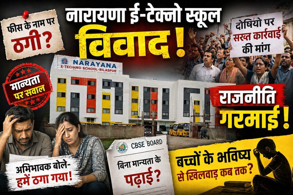 बिलासपुर29 अप्रैल 2026/ शहर में संचालित नारायणा ई-टेक्नो स्कूल इन दिनों गंभीर विवादों में घिर गया है। पालकों और छात्रों से कथित धोखाधड़ी के मामले ने अब राजनीतिक रंग ले लिया है। भाजपा और कांग्रेस दोनों दलों के नेताओं ने इस प्रकरण को लेकर कड़ी प्रतिक्रिया दी है और दोषियों के खिलाफ सख्त कार्रवाई की मांग उठाई है। मामले के अनुसार, स्कूल प्रबंधन पर आरोप है कि बच्चों को प्रवेश दिलाने के नाम पर अभिभावकों से मोटी फीस वसूली गई, लेकिन बाद में कई अनियमितताएं सामने आईं। आरोप यह भी है कि बच्चों को बिना मान्यता के पढ़ाया जा रहा था और सीबीएसई बोर्ड की परीक्षा दिलाने के नाम पर अभिभावकों को गुमराह किया गया। जब सच्चाई सामने आई, तो पालकों में आक्रोश फैल गया।