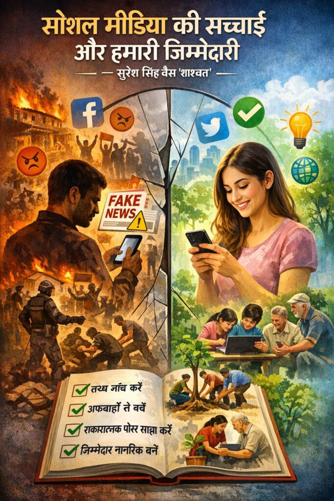 ऐसे में सवाल यह नहीं है कि सोशल मीडिया गलत है बल्कि सवाल यह है कि हम उसका उपयोग कैसे कर रहे हैं।इस पर हमारी जिम्मेदारी क्या होनी चाहिए?- किसी भी पोस्ट को साझा करने से पहले उसकी सत्यता की जांच करें भावनात्मक या उकसाने वाली खबरों से सावधान रहें।विश्वसनीय स्रोतों पर ही विश्वास करें। समाज में सकारात्मक और रचनात्मक सामग्री को बढ़ावा दें।